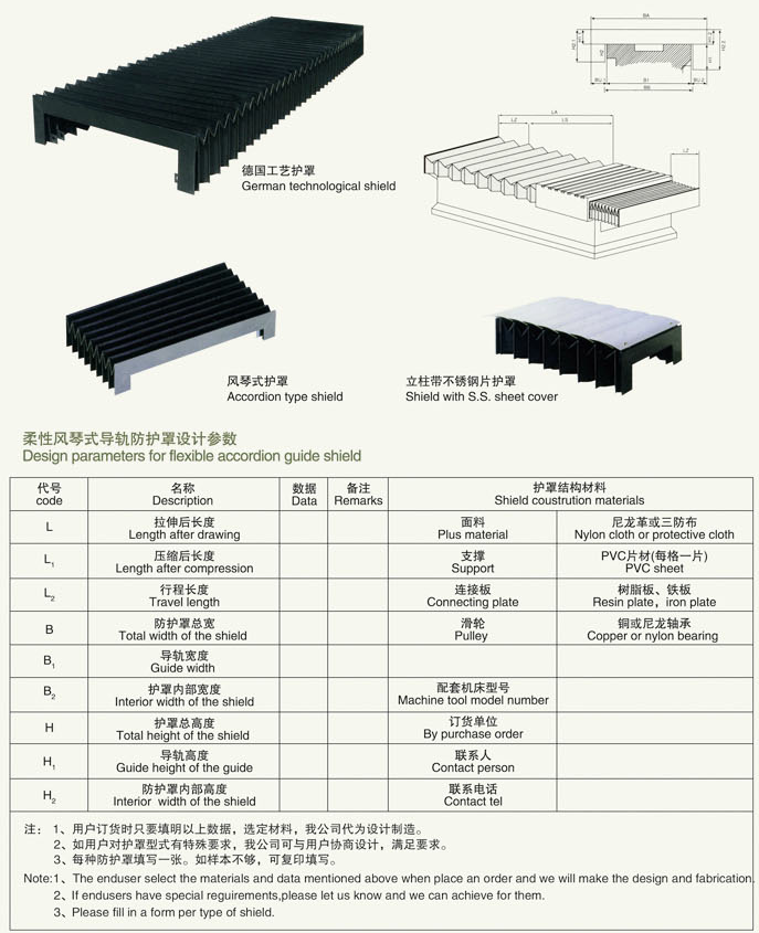 產(chǎn)品概述:風(fēng)琴式防護(hù)罩(皮老虎)-技術(shù)數(shù)據(jù):是可以任意組合的產(chǎn)品系列,其原材料.外形.加工處理方式及尺寸大小都可以根據(jù)實(shí)際情況而定。