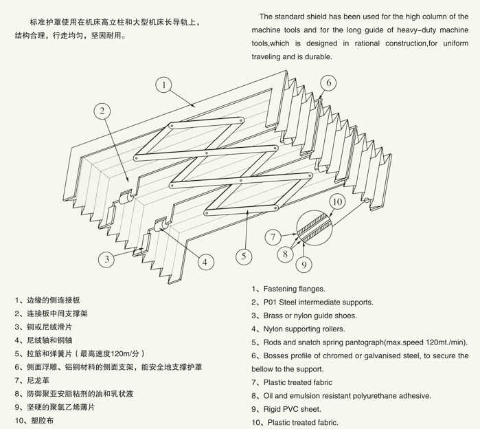 1.風(fēng)琴式防護(hù)罩(皮 老虎)-它的一個基本組成部分是在每個折頁里都裝 有一個起支撐穩(wěn)定作用的PVC骨架,此骨架可以通過不同的加工方式與外部折頁材料緊密相連。一種是熱粘接。在一定的溫度下,借助特殊助熔劑就可以使內(nèi)部的 PVC骨架與外部的折頁牢固地粘接在一起。若護(hù)罩是在中等溫度環(huán)境下使用,就可以選用此種方式。此種熱粘接護(hù)罩完全不用對其進(jìn)行保養(yǎng),且防水、防塵、耐 油、耐酸。