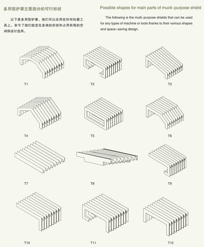 多用型風(fēng)琴防護罩,此防護罩壓縮小行程大,不怕踩踏,可根據(jù)你的要求設(shè)計形狀,設(shè)計范圍非常廣泛,常用形狀有一字型、U型、7字行、方形、圓形等。風(fēng)琴防護罩使用特殊的材料耐冷卻液、防水、防油、防鐵屑、硬物撞擊不變形、不怕腳踩、遠行輕便、壽命長、密封好、防護罩內(nèi)沒有任何金屬部件,不用擔(dān)心防護罩對機械造成不必要的損壞。風(fēng)琴防護罩產(chǎn)品具備結(jié)構(gòu)嚴緊、合理、無噪音、行程大、運動快、使用壽命長等特點。廣泛應(yīng)用于普通機床、數(shù)控機床、液壓機械等設(shè)備上。我們風(fēng)琴防護罩設(shè)備運行環(huán)境又可制作成鋼制支撐骨架、木質(zhì)骨架、PVC骨架、冷板骨架風(fēng)琴護罩等。根據(jù)設(shè)備運行環(huán)境風(fēng)琴護罩內(nèi)部結(jié)構(gòu)有槽型、滾輪、尼龍滑片、滑塊、拉筋、拉簧、尼龍軸。 |