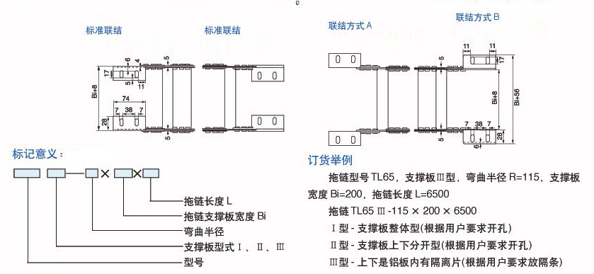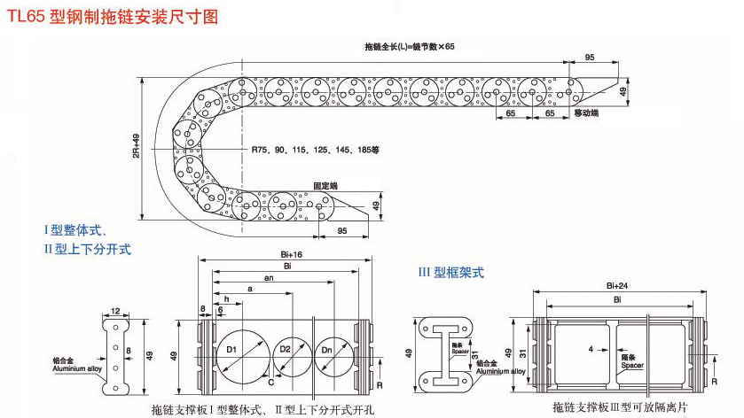 TL65系列拖鏈的主體是由鏈板(優(yōu)質(zhì)鋼板鍍鉻)支撐板(擠拉鋁合金)軸銷(合金鋼)等部件組成,使電纜或橡膠管與拖鏈之間不產(chǎn)生相對(duì)運(yùn)動(dòng),不產(chǎn)生扭曲變形,鏈板經(jīng)鍍鉻處理外形效果新穎,結(jié)構(gòu)合理,靈巧強(qiáng)度高,鋼性好不變形,安裝方便,使用可靠,易拆裝,尤其是本產(chǎn)品采用了高強(qiáng)度耐磨材料,合金為軸銷,提高了產(chǎn)品的耐磨強(qiáng)度,彎曲更靈活,阻力更小,降低了噪音,從而可保證長(zhǎng)時(shí)間不變形,不下垂。 |