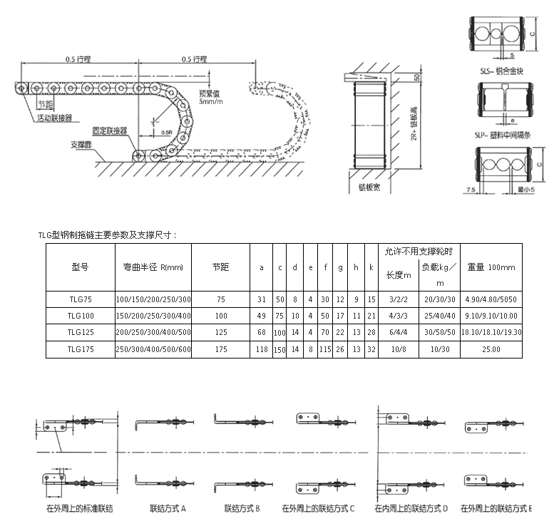 TLG型鋼制拖鏈可承載數(shù)量多,重量大的電纜及油管,自由懸置(允許不用支承輪)長度大,支撐板可依顧客需要制作,適用于工作母機,移動機械等。其彎曲半徑為50-600mm,鏈板高度為35-150mm,可任意選用?! ?TLG型鋼制拖鏈其使用行程最大為32米。適用于所有傳動方式??呻S意加長和縮短。此外,可通過改變銷軸獲得改變彎曲半徑。 |