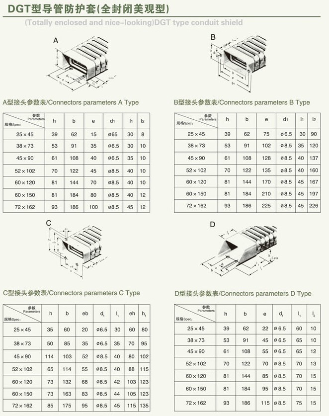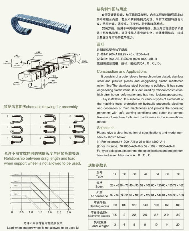 DGT型導(dǎo)管防護(hù)套,此產(chǎn)品是一種新穎的機(jī)床功能部件,它適用于數(shù)控機(jī)床、加工中心等各類機(jī)床作為電線、電纜、液、氣軟管的防護(hù)裝置,能隨機(jī)床移動部件協(xié)調(diào)地運(yùn)行,可延長被保護(hù)的電線、電纜、液、氣軟管的使用壽命,降低消耗,并大大改善了機(jī)床的電線、電纜、液、氣軟管分布零亂的狀況,增強(qiáng)機(jī)床整體藝術(shù)造型效果,增強(qiáng)了我國機(jī)床在國際市場的競爭能力。 套板外經(jīng)鍍鉻處理,和不銹鋼及塑料,內(nèi)有工程塑料增強(qiáng)尼龍66加纖維組合而成;套板不銹鋼拋光處理,內(nèi)有工程塑料組合而成;結(jié)構(gòu)合理,強(qiáng)度高、不變型、外型精美等優(yōu)點(diǎn)。 |