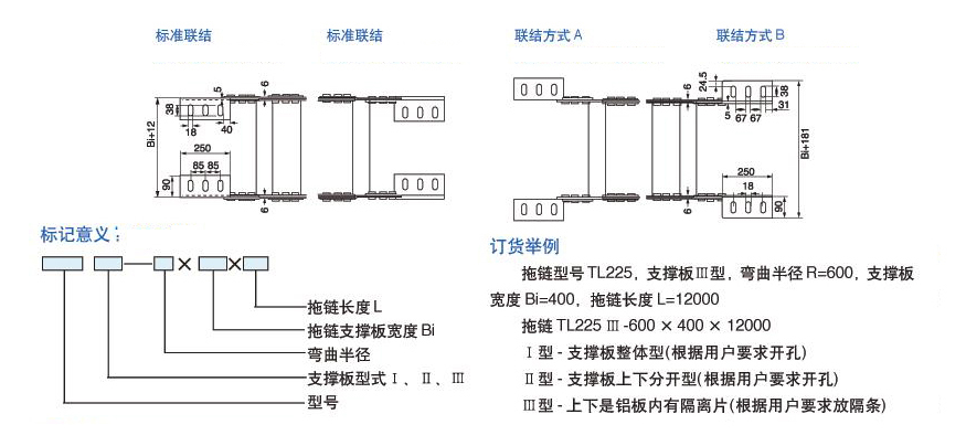TL系列拖鏈的主體是由鏈板(優(yōu)質(zhì)鋼板鍍鉻)支撐板(擠拉鋁合金)軸銷(合金鋼)等部件組成,使電纜或橡膠管與拖鏈之間不產(chǎn)生相對(duì)運(yùn)動(dòng),不產(chǎn)生扭曲變形,鏈板經(jīng)鍍鉻處理外形效果新穎,結(jié)構(gòu)合理,靈巧強(qiáng)度高,鋼性好不變形,安裝方便,使用可靠,易拆裝,尤其是本產(chǎn)品采用了高強(qiáng)度耐磨材料,合金為軸銷,提高了產(chǎn)品的耐磨強(qiáng)度,彎曲更靈活,阻力更小,降低了噪音,從而可保證長(zhǎng)時(shí)間不變形,不下垂。 |